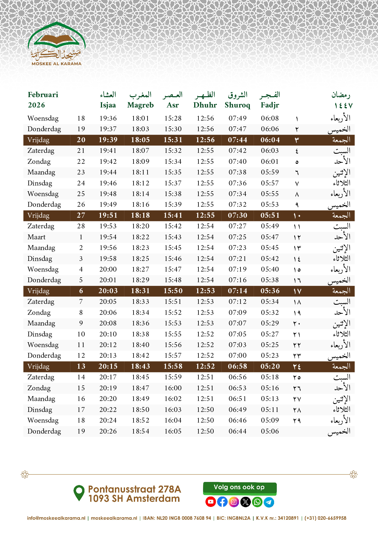 | Vrijdag | 13 | 20:15 | 18:43 | 15:58 | 12:52 | 06:58 | 05:20 | ٢٤ | الجمعة |